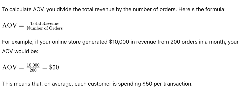 In simple terms, Average Order Value (AOV) is the average amount of money a customer spends per transaction on your website or in your store. It’s a vital metric that provides insight into customer purchasing behavior and can help you strategize for better sales performance.